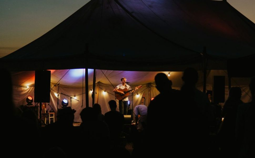 Gräs kan fungera vid högsommar och torr mark, men redan en lätt regnskur gör underlaget ojämnt, blött och svårmöblerat. Ett enkelt golv eller trägolv skapar en stabil yta, minskar snubbelrisk och gör det lättare att placera stolar, bord och scen.